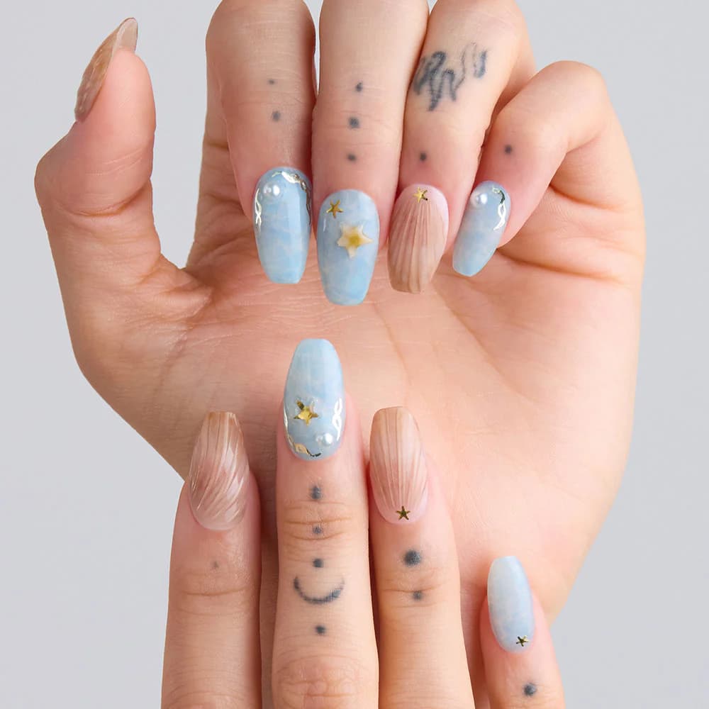 Bu tasarımın en güçlü yanı, yarattığı derinlik hissi. Tırnağınıza baktığınızda, sanki üç boyutlu bir galaksinin içine bakıyormuşsunuz gibi hissediyorsunuz. Mavi ve gümüş glitter parçacıklarının degrade (geçişli) kullanımı, tırnaklara dinamik bir hareket katıyor.